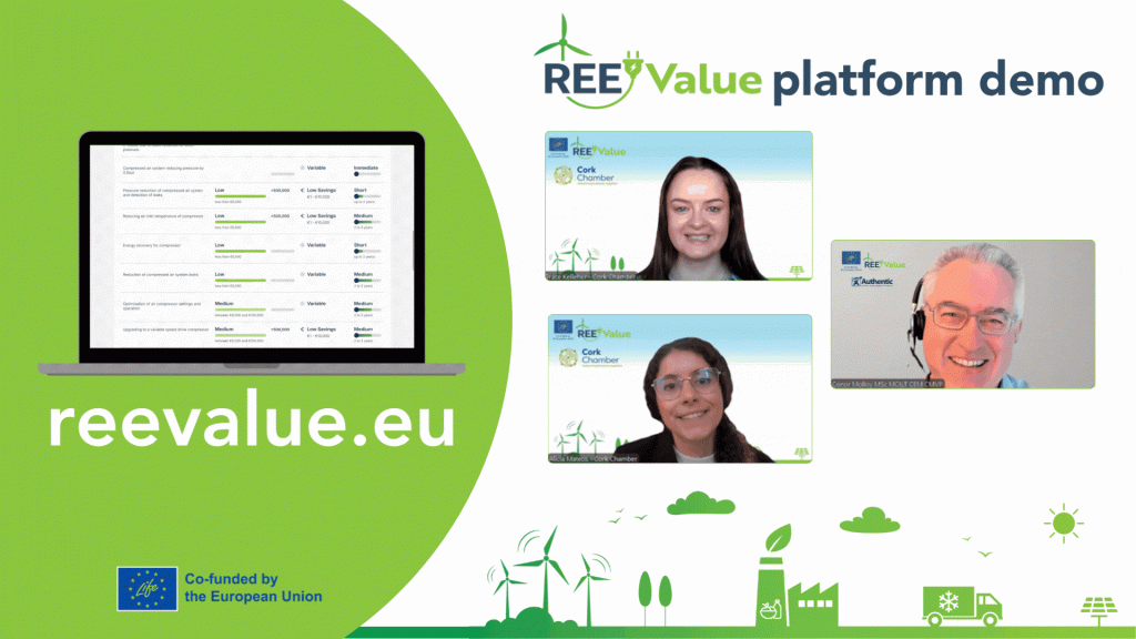 In May 2025, Cork Chamber and AEMS hosted the REEValue Platform Demo, a live demonstration of the recently launched REEValue.eu platform, a powerful new online tool designed to help European businesses reduce carbon emissions and cut operational costs.
